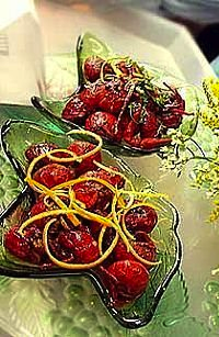 2.盛出一半的龙虾尾和红油,中火加热锅内剩余一半,同时加入橙肉翻炒半分钟,加一杯清水,水量以没过虾尾为适度.加锅盖闷烧5分钟,其间翻动两次以使虾尾均匀吸收汤汁,待汤汁收至1/3时,加少许鸡精起锅.用筷子夹出虾尾盛盘,表面洒上橙皮丝.