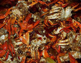 2、花雕酒香蟹:蓝蟹洗涤干净,大火水滚后放一大杯花雕酒,再隔水蒸大约10分钟即成,可沾姜絲与香醋。