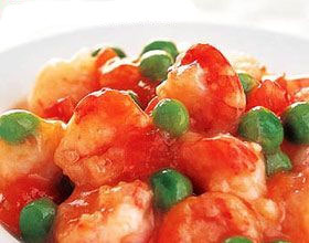 4.高汤煮滚后加入番茄酱、盐、糖10克、醋10克、味精5克,待再滚起时用生粉水勾芡,倒入虾仁、豌豆拌匀,盛起置于汤碗中。