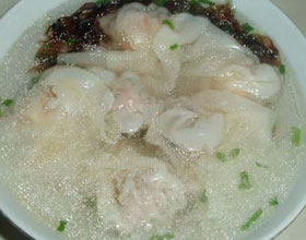 3.用旺火将水烧沸后,放馄饨下去煮,并用铁勺的背部在锅底不时搅动,见馄饨浮起即熟,碗内放鲜汤,猪油,撒些葱末,再将馄饨盛入碗内即成。
