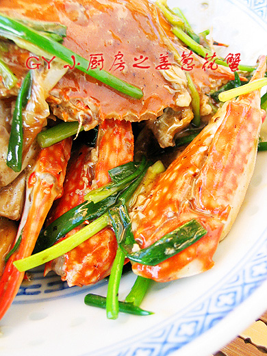 4:姜锅姜,煮至蟹熟,把葱段(叶的那部分)加入,打芡汁(生粉,少话水,酱油),大火收汁,即可。