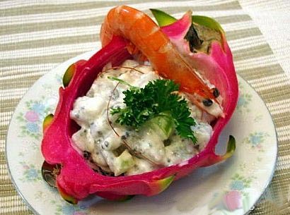 第一种:海鲜菜谱火龙果大虾沙拉做法