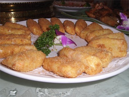 1、鲜贝、虾仁洗净用开水焯好,同蟹柳切成丁,加盐、味精、姜汁、卡夫奇妙酱搅拌成馅,用威化纸包卷,粘鸡蛋液,滚粘面包渣。