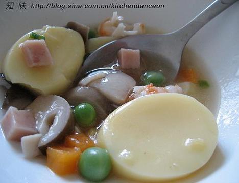 日本豆腐2支,鲜虾若干只,草菇,午餐肉,胡萝卜,豌豆,大骨头,葱,姜,胡椒粉,芡粉