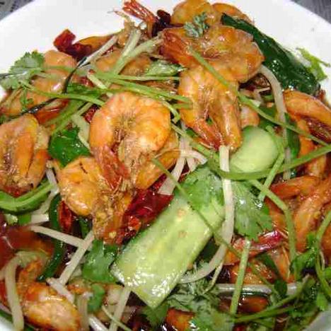6在炸虾的余油中加4匙辣椒油,烧开后倒入豆芽.蒜苗.西芹.青瓜,并加入盐和鸡粉调味,待豆芽断生后将所有材料捞出倒在深碗中,将虾和辣椒铺于上层,淋上炸油,并用香菜段和葱段点缀。
