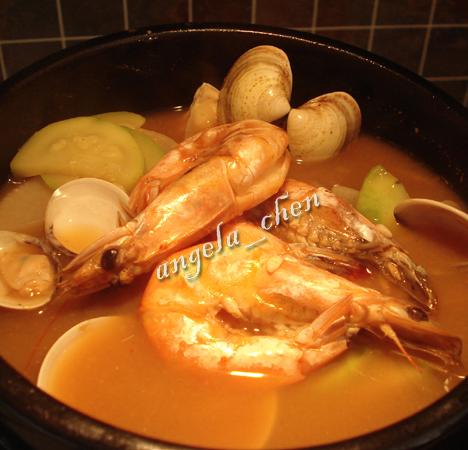 泡菜,蛤蜊,明虾,蘑菇,西葫芦,豆腐,蒜末1瓣,盐,鸡精,黄豆酱2汤勺,韩式辣酱1-2汤匙(依个人口味增减)