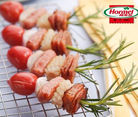 3、将鸡肉肠、枫香培根、洋葱、鱿鱼、圣女果穿在竹签上,包入锡纸内,放入已经预热的烤箱,180度烤10分钟即可。