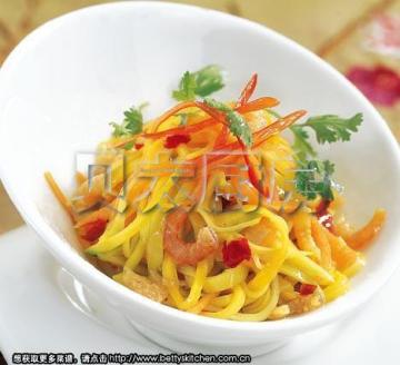 3.将所有材料b与调味料放入大盆中,充份调匀后,放入作法1的面条和煮熟的虾仁拌匀装盘即可。