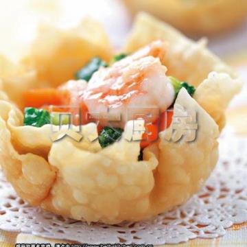 9、将炒好的菜盛入烤好的馄饨皮金盏中即可