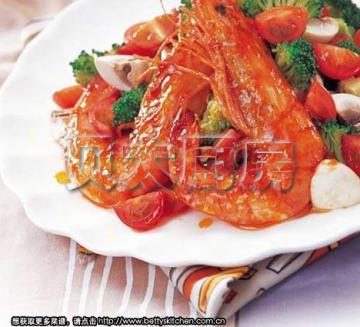 大虾2只,西兰花1棵,口蘑100g,番茄1个,番茄沙司2汤匙(30ml),大葱花1茶匙(5g),姜末1茶匙(5g),蒜茸1茶匙(5g),绍酒1汤匙(15ml),盐1茶匙(5g),白砂糖1汤匙(15g),生抽1汤匙(15ml),油2汤匙(30ml)