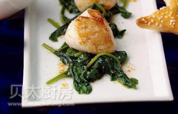 将扇贝肉放在菠菜叶上,最后淋上藏红花奶油汁即可。