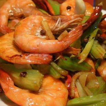 原料:鲜虾,芹菜,干辣椒,麻椒,葱姜蒜