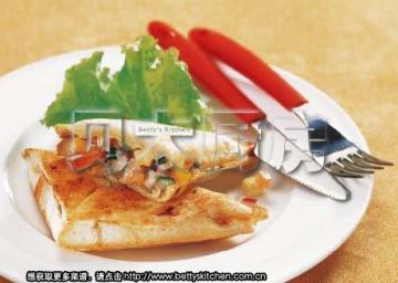 这个饼有虾、蔬菜、吃的时候有牛排酱的蘸食,美味呀!