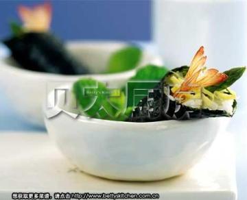 材料:芦笋3支 紫菜1张 草虾去皮3支 沙拉酱少许。
