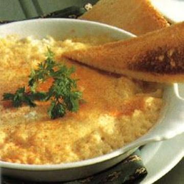 黄油(涂抹烘盘用)适量,罐装蟹肉170克,白兰地酒2茶匙,大鸡蛋4个,盐、黑胡椒适量,奶油4汤匙,红辣椒粉适量,面包4片,黄油1—2汤匙,点缀:,细叶芹数枝