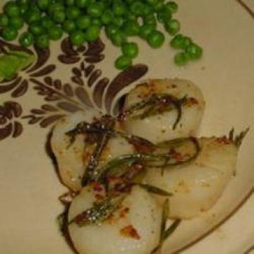 1.用中高火在中等大小煎锅里溶化黄油。加刮碎的蒜和整枝的迷迭香,然后加扇贝肉,每面煎2分钟(或喜欢几分熟就煎几分熟)。将蒜和迷迭香从锅里挑出来,就可以上桌了。
