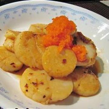2.快火下油起锅,先把爆香蒜蓉,下扇贝肉略炒,下汁料炒至金黄,装盘铺上飞鱼子即成。