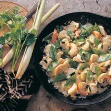 清鸡汤(或高汤)125毫升,糖荚豌豆175克,冬葱2颗,花生油2汤匙,香茅1枝,泰国绿咖喱酱2茶匙,新鲜或干莱姆(青柠)叶3片,椰奶150毫升,新鲜扇贝350克,新鲜香菜(芫荽)数枝