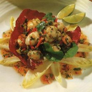 5.用漏匙从锅里舀出扇贝,排放在沙拉上。浇上沙拉酱;用橘瓣形莱姆块和香菜枝点缀,立即上桌。