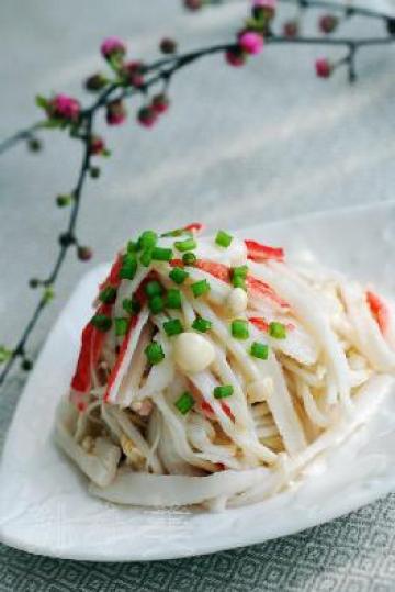 金针菇100g,蟹肉棒150g,调料:盐3g,味精2g,香油4g,米醋3g,香葱3g