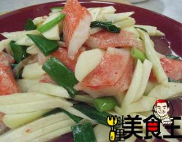 第二种:海鲜菜谱材料:茭白笋300克,蟹肉棒100克,葱2根做法