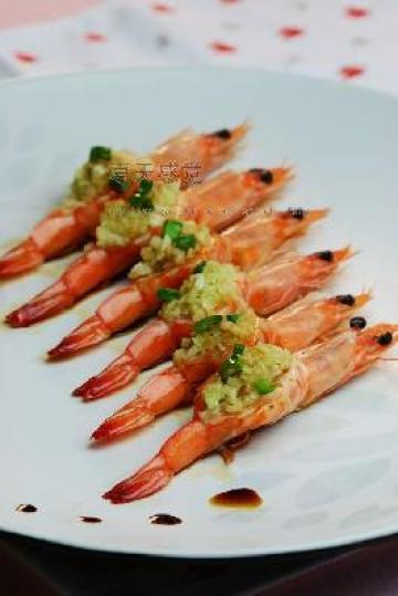 3、将调好的蒜茸均匀地浇在斑节虾上,然后上笼蒸4分钟即成。