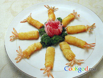 此菜将鸡脯蓉裹在大虾上,包干层酥炸制,造型新颖、别致。