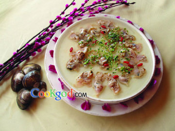 文蛤500克,豆浆300克,香菜5克,枸杞5克。调料精盐10克,味精5克,加饭酒5克,胡椒粉5克,石膏5克,湿淀粉5克。