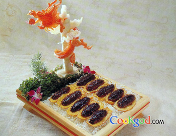 3、煨好的辽参里侧拍生粉,酿入虾胶,底部沾面粉,拖蛋黄糊,入平锅煎熟,装盘,点缀盘饰即成。