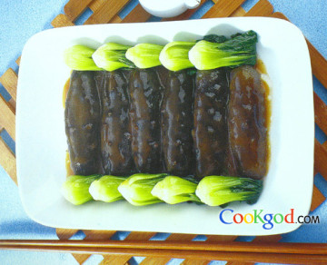 3、大火烧开,转入小火煨至入味,铲出海参装盘,菜心围边,原汁勾芡淋在海参面上即可。