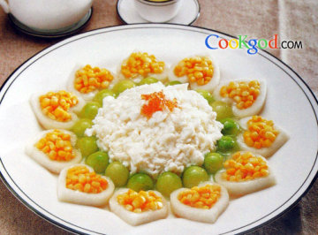 1、蟹子蒸熟取肉。蛋清加汤、盐、味精、牛奶、湿淀粉调匀。莴苣刻成球,冬瓜刻成桃形瓜环。