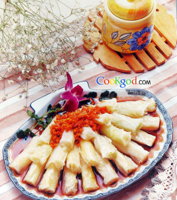 3、将高汤、蟹肉放入锅内,勾芡,浇在鱼肚上,用菜心点缀一边即成。