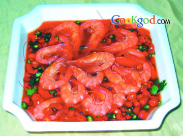 食虾时若去皮即食则微辣鲜爽,若再回沾味汁则辣香入腑,即使冷食,鲜辣也凸显无遗。