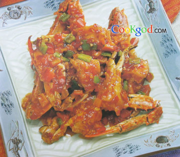 3、炒锅留油少许,下入葱姜片、桂林辣椒酱炒片刻,烹料酒,加汤、盐、番茄汁、糖、蟹块,烧至汤将收尽,撒入青红椒丁,出锅即成。