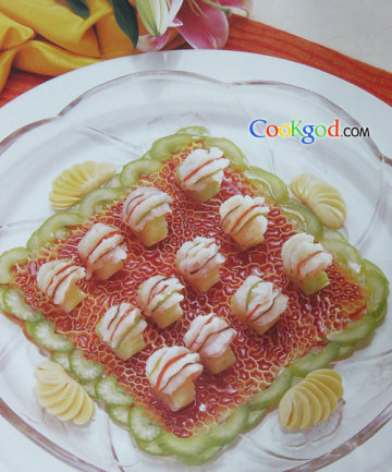 应选鲜活、均匀大只的对虾,沙线要去净,焯水时断生即可。