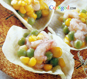 3、生菜剥开叶片,修剪成小碗状,将做好的海鲜用汤匙盛入生菜碗,装盘即可。