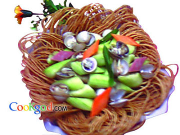 3、取原汤放入带壳蛤蜊、丝瓜、木耳、笋尖、葱段、姜片大火烧5分钟,放盐、味精、鸡精、豆油、猪油调味后倒入茶馓即可。