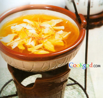 (3)锅中放上汤750g,加鱼翅、精盐2g、味精1g、鸡粉2g,撤胡椒粉,烧开,尝口出锅,盛入吊锅中,倒入焯过水的蟹肉;