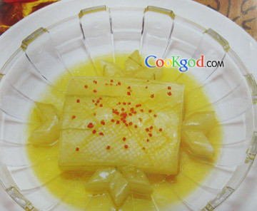 1、冬瓜去皮修成四方状,剞十字花刀,放入鸡油、盐、味精、高汤,入笼蒸熟。