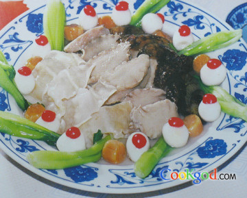 2、刺参、鲍鱼、鱼肚、干贝码入碗内,加葱、姜片、绍酒、鸡油各10克,精盐2克,鸡汤放入蒸锅内蒸约30分钟。