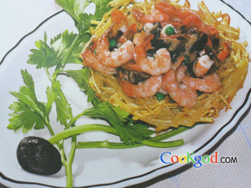 虾去头壳治净,加调料,淀粉拌匀,马铃薯丝摆成燕窝状,下7成热油中炸至浅黄色。