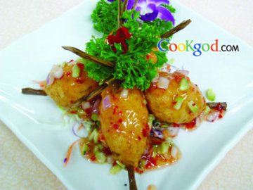 2、将鸡酱与黄瓜、洋葱粒拌匀,淋在炸好的虾上,点缀法香和红椒圈即可。