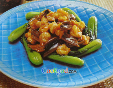 3.煸炒香菇、笋片,调味,加主料炒匀,勾芡装盘,用焯熟的油菜心围边即可。