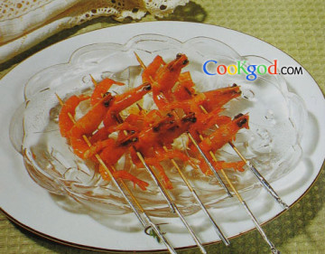 斑节虾400克,竹扦数根调料鸡汁酱、白醋、糖、味精各少许