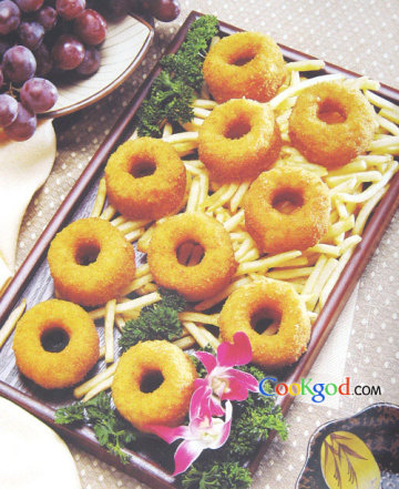 3、将虾泥放入纸兜中,均匀地挤在苹果环内,再拖上鸡蛋液,拍上面包糠,下入五成热油锅中炸至色泽金黄时捞出,沥干油装盘,上席时带一碟果酱。
