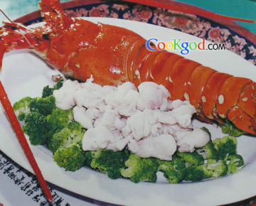 4、锅内放入余下的油烧热,下入西蓝花煸炒,加入余下的精盐炒匀至熟,加味精炒匀,出锅装入盘的一端。炒好的龙虾肉放在西蓝花上面。将龙虾壳入蒸锅内用大火蒸3分钟左右,取出摆在盘的另一端即成。