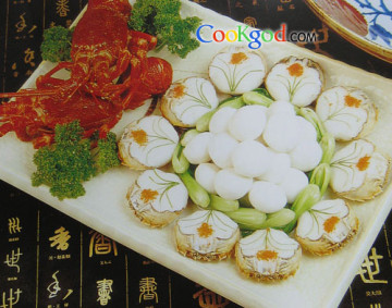 1、将龙虾肉取出洗净加上成虾蓉,加入盐、味精、姜汁、蛋清、湿淀粉搅拌上劲待用。蟹黄制成团待用,鱼蓉放入蟹斗内抹匀,用蟹黄、葱丝制成兰花状,蒸熟摆入盘边。