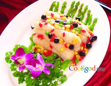 发好竹荪200克,老人头50克,鸡枞菌50克,水发刺参50克,目鱼20克,黑珍珠15克,玉米粒15克,青豆6克,芦笋100克,红椒粒5克。调料盐6克,味精3克,糖6克,胡椒粉2克,姜汁10克,高汤150克,湿生粉15克,香油3克。