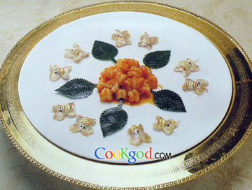 3、象形彩蝶入蒸箱蒸制,浇白汁,围摆入盘中。炸制好的虾仁裹匀糖醋汁,装在盘中间,点缀即成。