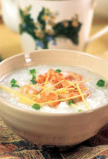 2.米淘洗后加清水适量(要一次放足水),放进几片姜,熬至米粒 开花(粥的稀烂程度可根据各从口味来控制熬粥的时间),然后把火调大,把腌过的虾放进粥里,放盐和少许鸡精(虾放进 锅里后要用勺子不停搅拌,以免粘锅),